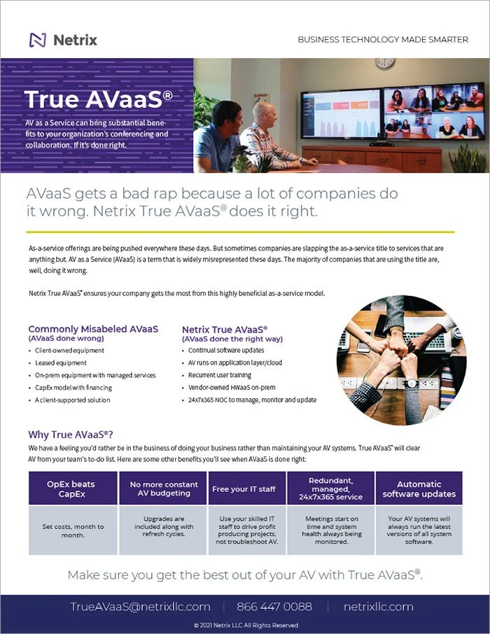 In addition to creating collateral for the Netrix Global Collaboration Services practice, I would occasionally introduce original branding ideas. True AVaaS® is an example of a service I named to accentuate Netrix’s differentiation in the AV-as-a-Service offering.
